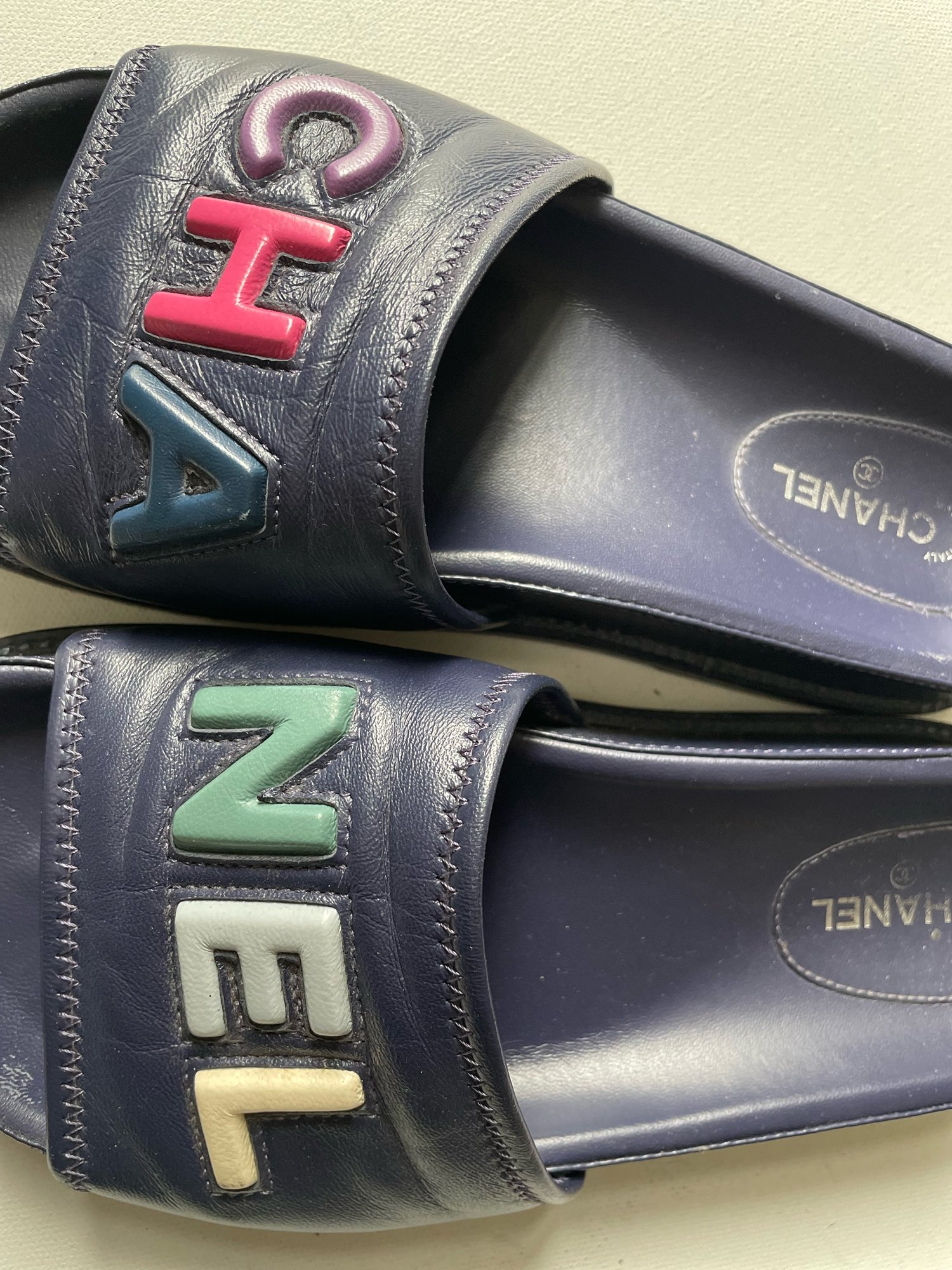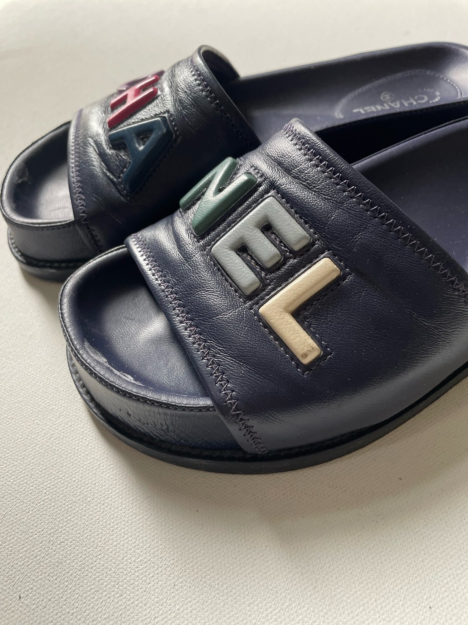 Chanel logo slides in navy leather